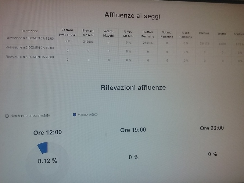Secondo il Ministero dell’Interno alle 12 nella nostra regione si è recato alle urne il 6.36% degli elettori. In particolare, sempre secondo il Viminale, nel capoluogo siciliano l’affluenza è al 6,64% (come potete vedere qui e nella foto sopra).  Per il Comune di Palermo invece la percentuale è dell’8,12% (questo il link) come potete vedere anche nella foto del sito di Palazzo delle Aquile qui sotto.