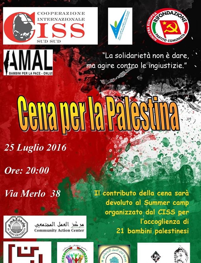 Lunedì 25 Luglio in via Merlo una cena in onore di un gruppo di bambini palestinesi nel capoluogo siciliano per un summer camp. Il contributo richiesto è solo di 10 euro. L’iniziativa è della Ong CIIS ed è supportata anche da Rifondazione Comunista. Una occasione conviviale e di impegno civile