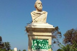 “Pirata assassino”: nella città in cui sbarcarono le camicie rosse, qualcuno, con della vernice verde, ha scritto queste parole sul busto di marmo di Giuseppe Garibaldi, in piazza della Vittoria.