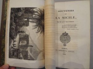 Il conte Auguste de Forbin, pittore e scultore occupa un posto di spicco nella parabola dei graveurs e dei cronisti che percorrevano la Sicilia nei primi decenni del secolo decimonono. Lo scrittore, pittore, intenditore d’arte, competente archeologo, viaggiatore, promotore culturale nell’amministrazione francese, Louis-Nicolas-Philippe-Auguste de Forbin nacque nel castello di La Roque d’Anthéron, sulle rive della Durance, il 19 agosto 1777. Compose i suoi Souvenirs de la Sicile tra il 1821 e il 1822 e l’anno successivo li editò per i torchi dell’Imprimerie Royale di Parigi, ma i ricordi del suo viaggio sono stati tradotti in italiano soltanto nel 2005. Egli si rivela come un osservatore misurato, colto, attento a cogliere con puntigliosa esattezza le coordinate sociali, culturali, antropologiche dell’isola, nel delicato periodo di transizione punteggiato dalle rivolte antiborboniche che di lì a quarant’anni sarebbero sfociate nell’Unità d’Italia.
