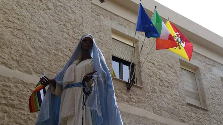 mezzo una barca decorata con simboli che rappresentano il mare, nel tipico modo che solo i sambiagesi sanno esprimere, attraverso il sapiente intreccio di materiali che madre natura offre. Sopra la barca una Madonna nera che versa le sue lacrime di dolore, straordinariamente bella e dannatamente triste, immagine struggente che suscita riflessione e pietà umana. Simboli, che, come un fuoco che si rigenera dalle ceneri, fa riemergere nell’animo l’umanità.