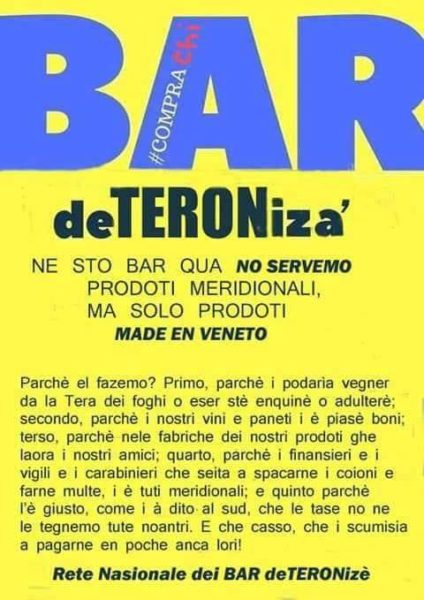 “In un Bar di Verona compare una locandina che va a sbeffeggiare una ‘Causa Giusta’, e a fare razzismo sui Meridionali.