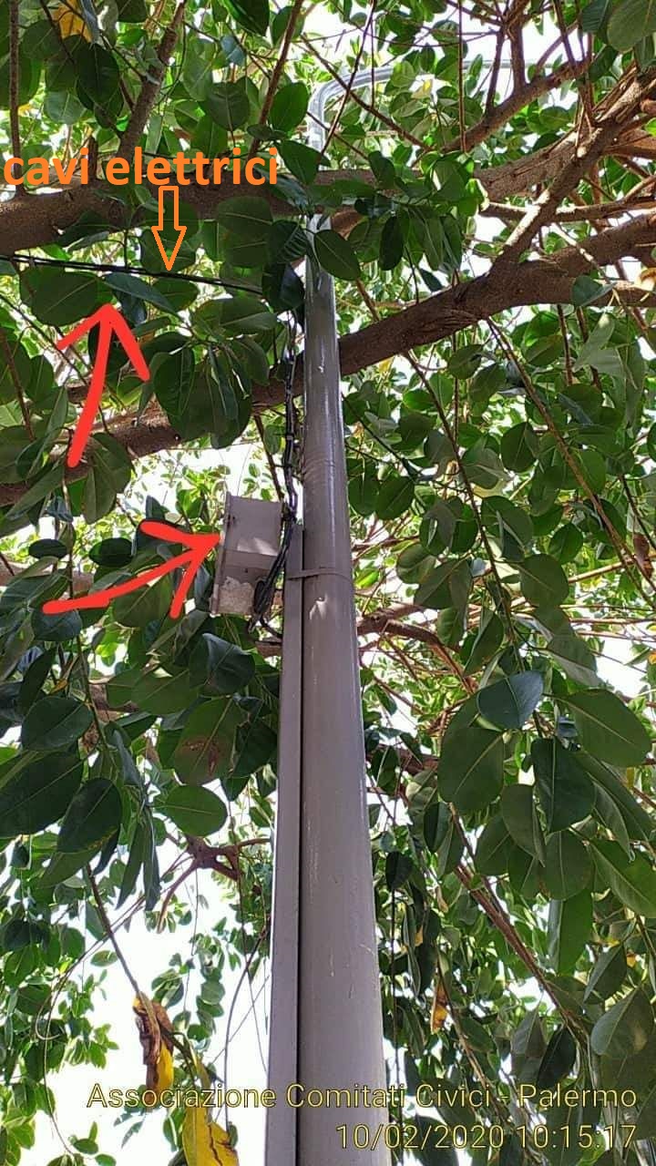 Vi chiediamo se tale impianto sia a norma e se rappresenti un pericolo per la pubblica incolumità. Inoltre, sempre nei pressi, ci hanno segnalato un palo dell’illuminazione pubblica, che è inglobato in un albero di ficus, privo della plafoniera che è caduta a causa del forte vento.
