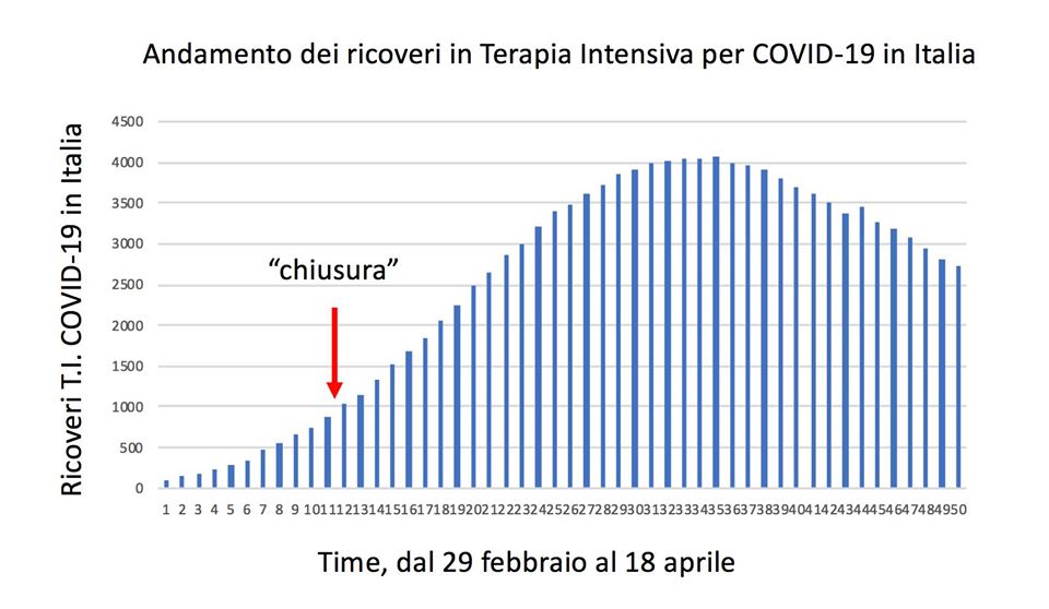 Sulla situazione italiana posto il grafico che vedete qui sotto generato con dati della Protezione Civile. Si riferisce al numero totale in Italia dei ricoverati in terapia intensive con diagnosi di COVID-19, dal 29 febbraio al 18 aprile. Da diversi giorni ho iniziato a seguire più di tutto questo numero perché sembra intercettare meglio di ogni altro indice l’andamento dell’epidemia in Italia. Il messaggio è chiarissimo: siamo in FASE CALANTE. Quanto ci vorrà per uscirne del tutto? Nessuno ovviamente può dirlo con certezza, ma estrapolando dalla curva, si dovrebbe arrivare a zero ricoveri nelle prossime 3-4 settimane.