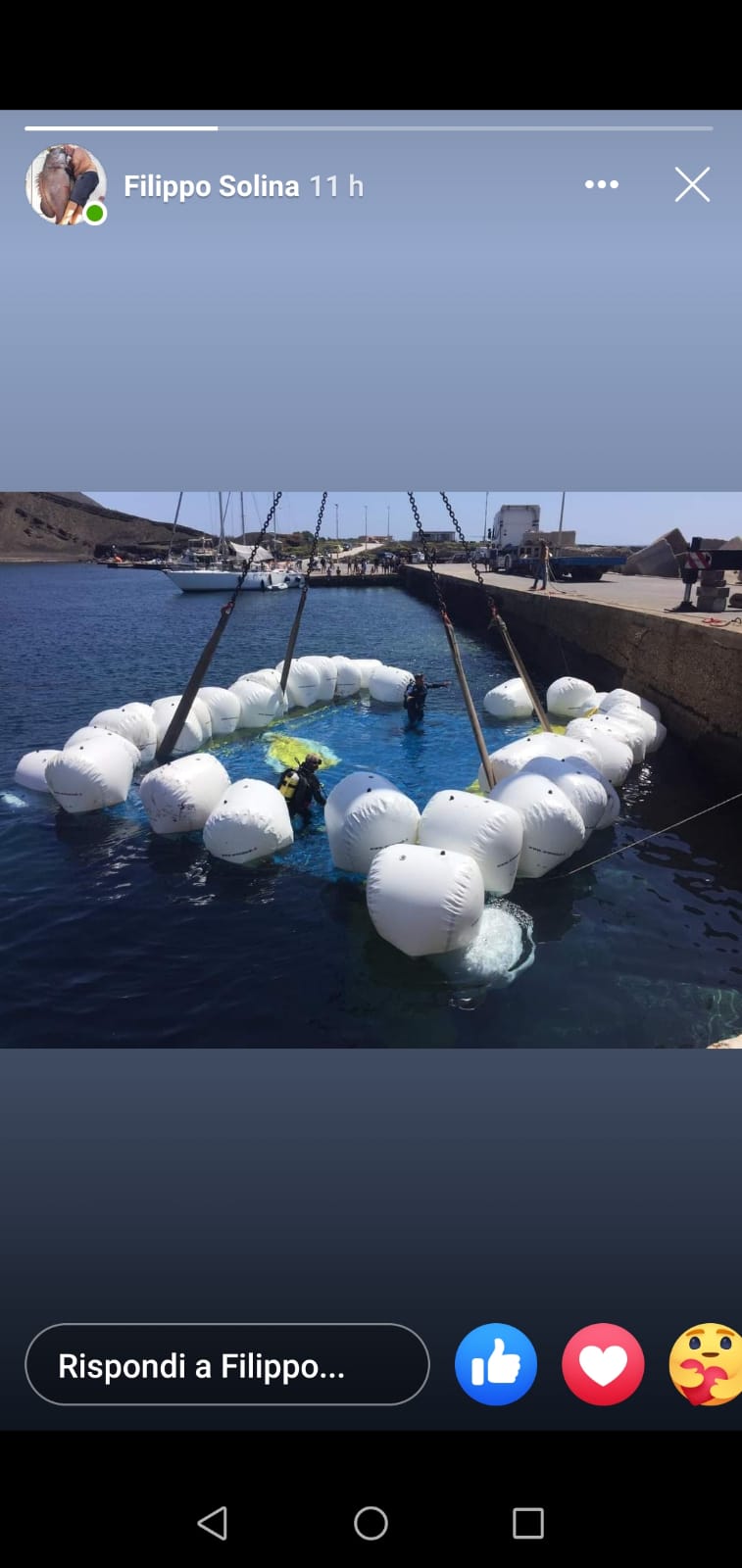 Tornare sulla nave? Non se ne parla nemmeno. Insomma, il portellone centrale della nave Sansovino non ne vuole sapere di risalire in superficie. Com’è noto, è finito in fondo al mare di Linosa nelle scorse settimane. E da lì non ne vuole sapere di venire a galla. Tra ieri e oggi, grazie ai palloni (che vedete nella foto), sono riusciti a spostarlo verso la spiaggia di Cala Pozzolana. Ma nulla di più.