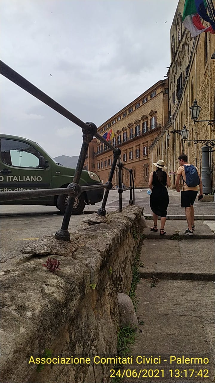 Chiediamo interventi al fine di garantire la sicurezza dei passanti, in gran parte turisti, ed a salvaguardia del decoro di un sito monumentale”. Ebbene, lo stacco dei paletti ha un significato ‘impressionista’, mentre l’assenza di una parte dell’inferriata è ‘cubismo’ allo stato puro: si tratta, infatti, di una raffinata forma di “maltrattamento” dell’inferriata che sarà servita a qualche ‘panormosauro’ che ha deciso di portarla con sé: da qui l’assenza-maltrattamento che ci riporta ai grandi temi del cubismo. In questo caso, insomma, non si tratta di “dissesto della ringhiera”, ma della creazione di forme artistiche che vanno valorizzate e tutelate. Tra l’altro, a due passi dalla ringhiera oggi ‘cubista’ ci sono due istituzioni perfettamente in grado di vivere l’arte di questo scorcia di città, l’Esercito e il Parlamento siciliano.