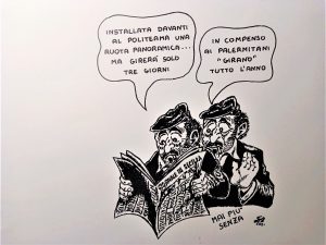 In effetti per completare l’opera di Palermo ci mancava una ruota panoramica in quella che un tempo era una delle più belle Piazza d’Italia. Considerato che gli appalti ferroviari per realizzare un’opera rigorosamente inutile che non si sa nemmeno se verrà completata – la ‘mitica’ chiusura dell’Anello ferroviario – hanno deturpato la Piazza, rilevato che anche gli alberi sono stati tagliati qualunque installazione, ormai, non fa né caldo, né freddo. Tra l’altro, il comunicato dell’assessorato regionale ai Beni culturali e a una sempre più improbabile Identità siciliana è ‘filologicamente’ rassicurante: “Il restauro di un monumento è la condizione posta dalla Soprintendenza per i Beni culturali e Ambientali di Palermo per autorizzare la realizzazione della ruota panoramica temporanea installata in piazza Ruggero Settimo. Il monumento individuato è il Palchetto della Musica di piazza Castelnuovo e l’intervento, sotto l’alta sorveglianza della Soprintendenza, inizierà nei prossimi giorni. La Campari Group, organizzatrice dell’evento Aperol together we can, infatti, a fronte del disagio temporaneo, finanzierà il restauro del Palchetto, lasciando un ristoro alla Città di Palermo. I lavori di restauro del Palchetto della Musica, per un importo di circa 25 mila euro, riguarderanno il trattamento miocida contro lo sviluppo di microorganismi, quello degli elementi metallici per eliminare le corrosioni e le condizioni originarie, la rimozione dei depositi dalle superfici lapidee, la rimozione e il riassorbimento delle macchie di ossidi di ferro e di rame, la riconfigurazione estetica degli elementi lapidei e metallici presenti nel monumento e la riconfigurazione materica ed estetica del soffitto ligneo”.