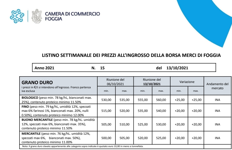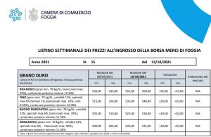 - In Puglia, a Foggia, in 7 giorni, il prezzo del grano duro è aumentato di 20 euro a tonnellata e oggi si commercializza a 54euro al quintale