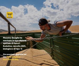 Cinque anni dopo i risultati si cominciano a vedere: “Immaginiamo migliaia di varianti della stessa specie di frumento, seminate sullo stesso terreno per anni, e ogni anno la natura seleziona le varietà più resistenti – leggiamo nell’articolo di oggi di Petra Evolutiva – così il campo di grano si aggancia alle variazioni climatiche, resistendo anche ad infestanti e malattie. Il grano evolutivo di Petra®, coltivato biologicamente in Sicilia, proviene da una popolazione costituita in Siria, mescolando i prodotti di circa 2000 incroci tra frumenti provenienti da tutto il mondo, e che quindi racchiude una straordinaria diversità”. Nell’articolo si riportano le coordinate del luogo – un ettaro di terra – dove è stato seminato il miscuglio di questo grano evolutivo biologico Solibam Li Rosi per Petra Evolutiva di Pane Quaglia. L’ettaro di terra si trova a Raddusa, provincia di Catania: “Il miscuglio ha generato una popolazione varietale di grano tenero, che è stato trasformato in lotto unico ed esclusivo in farina Petra Evolutiva di tipo 2, nel piccolo molino di Petra a Este (PD). In questo video momenti di questo grano che diventa farina“. Il miscuglio di grano tenero è stato seminato il 15 Dicembre del 2020. La prima emergenza delle piante è stata registrata nel Gennaio del 2021. La “Mietitura nell’ettaro ‘adottato’ della popolazione biologica evolutiva” è stata effettuata nel Giugno del 2021. Il 20 Dicembre del 2021 è stata effettuata la “Macinazione in Petra Evolutiva tipo 2 del raccolto di Pane Quaglia”. Interessantissimo un secondo video in cui Giuseppe Li Rosi racconta la sua esperienza con questo particolare grano dove illustra la differenza tra miscuglio e popolazione di grano.