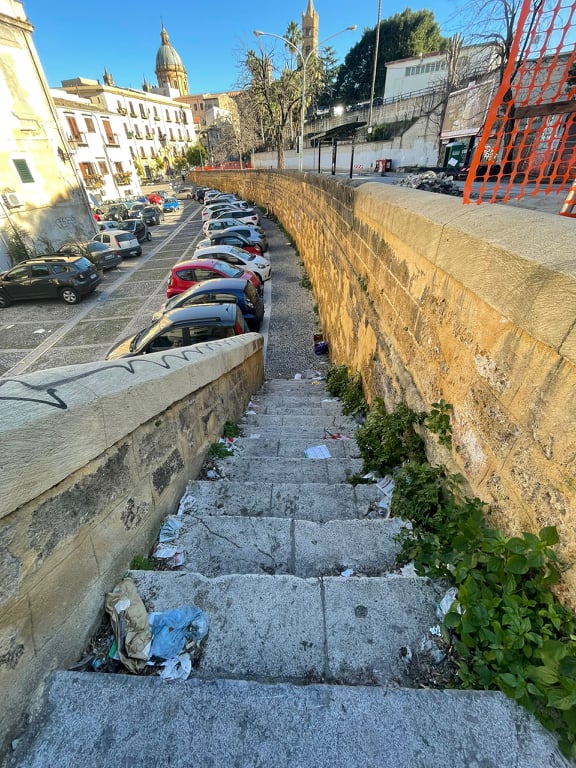 “Per recarci in Cattedrale – prosegue il racconto – abbiamo dovuto percorrere il tragitto che porta a piazza Papireto, recentemente restaurata e trasformata in zona pedonale… almeno così avevo letto nei vari servizi pubblicati dalla stampa. Scendere da quella scalinata cosparsa di spazzatura, con i sacchi abbandonati e le erbacce rigogliose che rendono difficile utilizzare i gradini, è stata una delle esperienze più umilianti da guida turistica. Avevo letteralmente la faccia a terra, c’era da impazzire per la rabbia. Come si può consentire di lasciare in questo stato un sito per il quale sono stati spesi circa 580 mila euro per la ripavimentazione e la messa a dimora di alberi? La cosiddetta zona pedonale è un inferno di auto posteggiate e la spazzatura è sparsa ovunque, come mostrano le foto scattate adesso, dopo una settimana da quel giro turistico. Un turista friulano mi ha chiesto spiegazioni, dicendo che gli incivili ci sono anche da loro, ma che il servizio di pulizia funziona rigorosamente. C’erano lattine, vestiti, scarpe, il tutto sparso lungo un itinerario monumentale… cavolo! La gente è incivile, si sa, anche se nessuno interviene, ma almeno puliscano! E’ un itinerario obbligato, con la chiusura della strada, perché non provvedono almeno a rendere dignitoso questo percorso? La piazza – conclude la guida turistica – è ridotta ad una pattumiera, ed ho fatto una figura orribile con i turisti. Sono ancora furente, ho provato una vergogna indicibile, una mortificazione immensa”. Commenta il presidente dell’Associazione Comitato Civici di Palermo: “Ricordiamo ai nostri governanti che il turismo rappresenta la principale, se non l’unica risorsa economica della città da salvaguardare”.