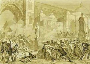 rivoltosi, in considerazione della sua posizione strategica, perché allocato vicino alle mura della città. La Rivolta del Sette e Mezzo (foto a destra tratta da Agrigento Ieri e Oggi), come tutti sanno, fu uno dei primi tentativi di ribellione, tutta palermitana, alla nuova Unità d’Italia e ai nuovi regnanti, e prese vita perché, già dopo pochi anni, molti “nuovi” italiani del Sud erano già stanchi di esserlo. Erano già stanchi di pagare più tasse di quelle che potevano, di essere coscritti per sei-sette anni per una vita militare che non avevano richiesto e che defraudava le loro famiglie di giovani braccia necessarie al lavoro dei campi, di essere trattati come barbari ignoranti da funzionari di governo altezzosi ed arroganti. In ultimo, ma non proprio ultimo per i palermitani, in questo caso i rivoltosi palermitani erano indignati perché l’eccessivo rigore del nuovo governo aveva cancellato la ricorrenza religiosa del 4 Settembre di Santa Rosalia.